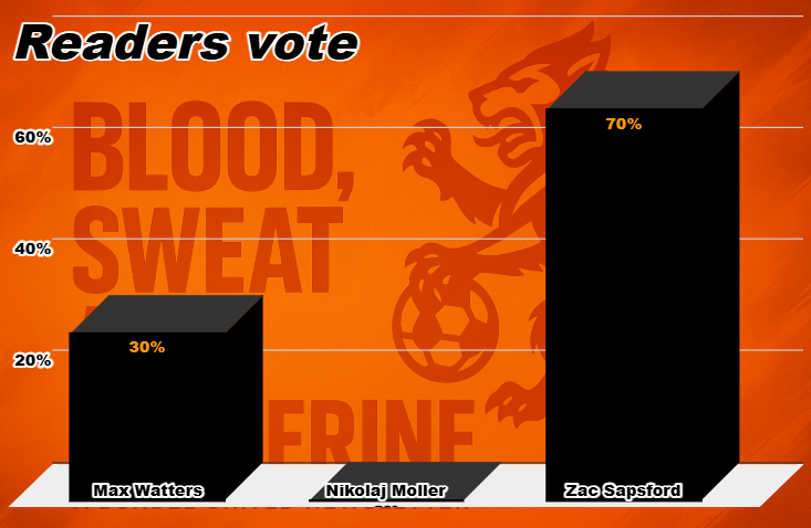 Three very different forwards are carrying Dundee United’s attacking hopes: Zac Sapsford, Max Watters, and Nikolaj Moller. Who deserves the spot in "Gorgeous Jim´s" starting line up? We asked the readers — and the verdict was emphatic. Readers’ vote: Zac Sapsford 70% — Max Watters 30% — Nikolaj Moller 0%.